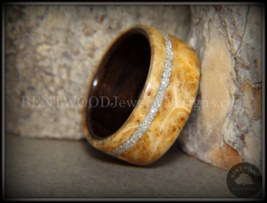 Bentwood Ring - Golden Amboyna Burl Ring on Ebony Wood Liner and Offset Silver Glass Inlay